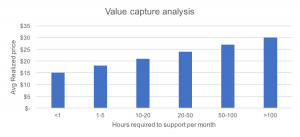 In the sample graph below, we plotted the number of hours required for customer issue and education support on the x-axis and the realized prices on the y-axis. Ideally, we would like the graph to look as is shown below; value captured grows from clients with greater consumption of the internal measure.